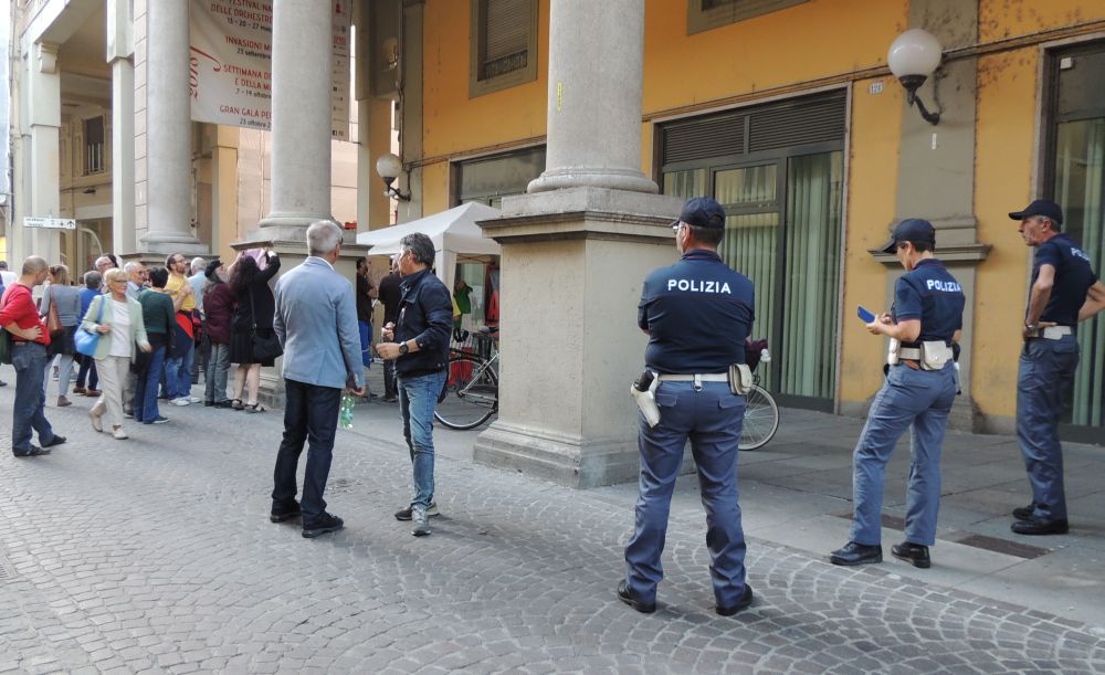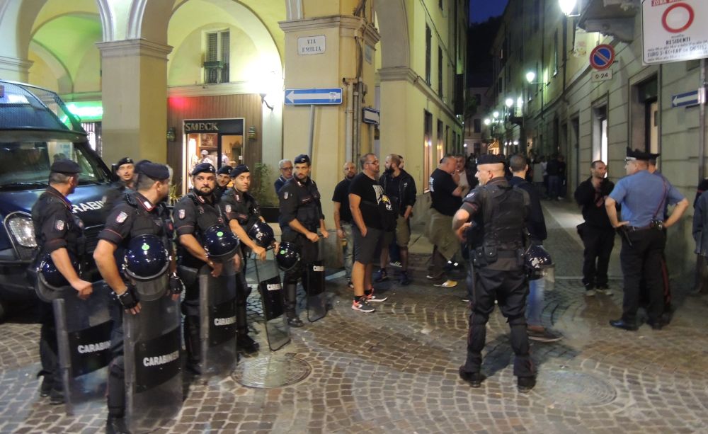 Un dispiegamento di forze di polizia in via Emilia davanti alla pasticceria Vercesi per impedire l’accesso dei simpatizzanti del comitato antifascista che protestavano in via Carducci, un altro cordone in Piazza Duomo all’inizio di via Pellizzari con i carabinieri in tuta antisommossa e un terzo cordone in fondo a via Pelizzari all’ingresso con piazza San Rocco. Tutti in divisa con scudo manganello.