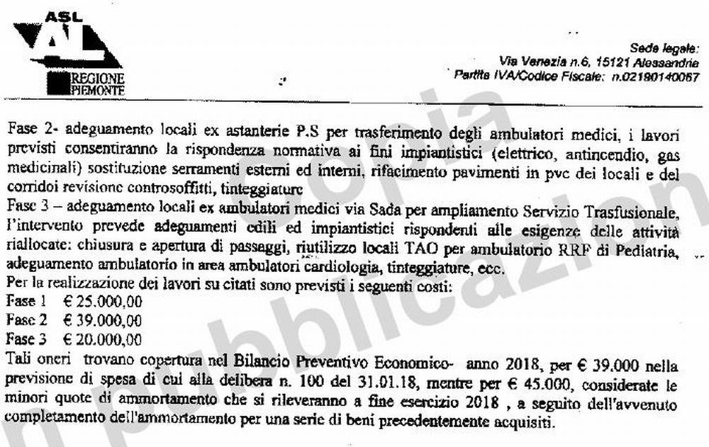 Immunoematologia e Medicina Trasfusionale dell’ospedale di Tortona. Gli interventi ricadono nella seconda fase del pèrcorso di adeguamento dei locali ex astanterie del Pronto Soccorso per trasferimento degli ambulatori medici e di epatologia, lavori che sommariamente consistono nella sostituzione serramenti esterni e interni, rifacimento pavimenti in PVC di locali e corridoi, revisione controsoffitti e tinteggiature; il tutto rientra nel programma triennale di interventi a seguito della riorganizzazione aziendale di cui alla DGR 1-600 del 19/11/2014 (il noto atto di declassamento dell’Ospedale di Tortona) per una spesa complessivamente quantificata dalla ASL AL con delibera 113/2018 pubblicata in Albo Pretorio in € 46.992,84 oneri fiscali e compensi incentivanti inclusi. Nello specifico, l’importo da destinare al fondo incentivante aziendale per le funzioni tecniche svolte dai dipendenti pubblici ammonta a € 789,00. Accantonamento previsto ai sensi dell’art. 113 c. 2 del D.Lgs. 50/2016 che recita: