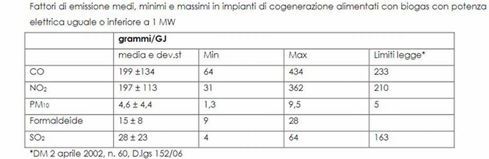La tabella seguente riporta i fattori di emissione (quantità di inquinanti emessi per unità di energia prodotta) di impianti di cogenerazione alimentati a biogas con una potenza elettrica installata compresa tra 0,5 e 1 MW, in base agli attuali dati di letteratura, ripresi da una recente pubblicazione (3)