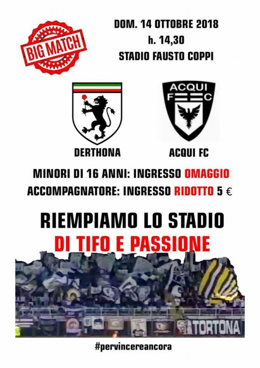 Domenica 14 ottobre 2018 alle h. 14,30 allo stadio F. Coppi di Tortona si disputerà l’incontro HSL Derthona – FC Acqui, big-match del campionato di Promozione.
