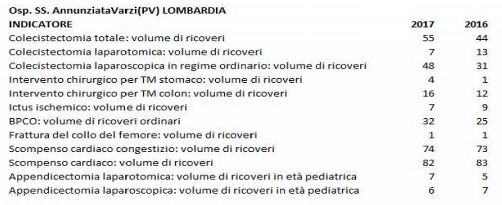 L’incremento dell’attività nell’ospedale di Varzi appare evidente: aumento del 25% di ricoveri per interventi alla cistifellea con miglioramento della tecnica operatoria, dimezzando gli interventi tramite laparotomia e aumentando del 50% quelli con tecnica laparoscopica, aumento del 30% negli interventi per tumore allo stomaco e del 33% per i tumori al colon, mentre rimangono allineati all’anno precedente i problemi tipici dell’età avanzata (frattura del collo del femore, broncopolmonite ostruttiva, scompenso cardiaco).