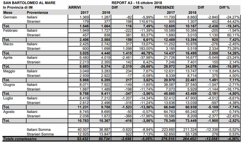 Brutte notizie per il turismo a San Bartolomeo al mare: i dati del mese di Agosto dell’Osservatorio turistico Regionale della Liguria sono molto negativi. In fatto di presenze annuali ha perso  il 4,36% ed è al terzo posto tra i Comuni che hanno avuto il maggior calo di turisti dopo Diano Marina (-5,32%) e Rapallo (-5,31). Dopo san Bartolomeo ci sono Alassio (-3,62) e Loano (-3,33).