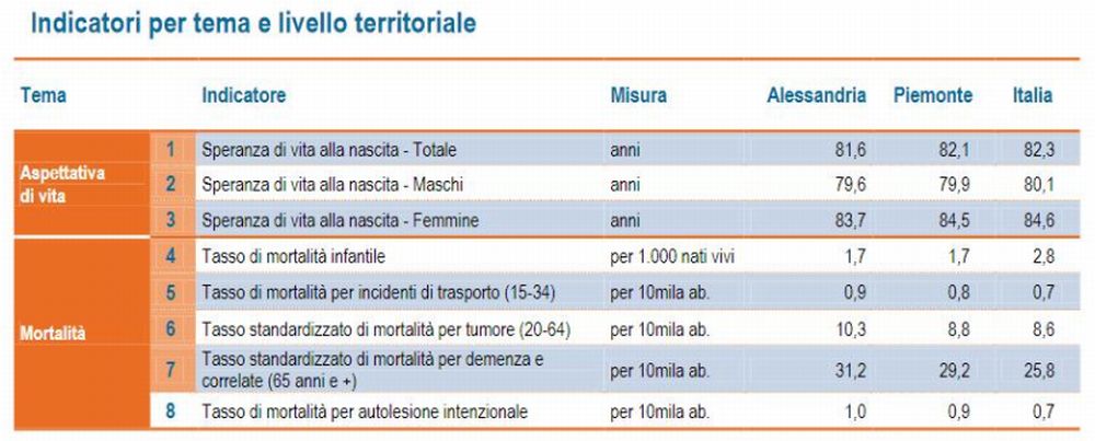 Anche gli altri indicatori di salute fotografano una situazione preoccupante. Sia il tasso di mortalità per incidenti di trasporto delle persone tra i 15 e i 34 anni, sia quello riguardante i suicidi superano i valori dell’intero territorio italiano e piemontese. In provincia di Alessandria si è esposti a maggiori rischi, sia per quanto riguarda le cause di mortalità potenzialmente evitabili, sia per tumore, sia per demenza tra le persone ultra65enni ed è elevato anche il tasso di mortalità per incidenti di trasporto: dato, quest’ultimo, che impone una riflessione riguardante la sicurezza della rete viaria e delle infrastrutture.