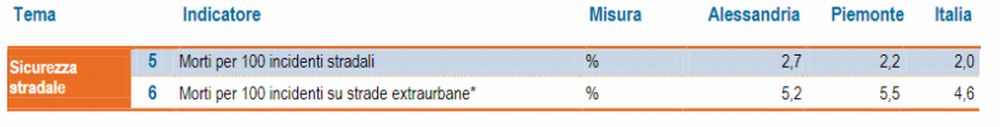 Il numero di morti ogni 100 incidenti stradali nella provincia di Alessandria (2,7%) risulta superiore sia al valore regionale (2,2%) che a quello nazionale (2%). Se da un lato non giova al bilancio la posizione baricentrica della provincia, attraversata da tre autostrade, il dato cala lievemente se si considerano le sole strade extraurbane, dove peraltro è registrata una mortalità che sebbene inferiore a quella regionale, rimane al di sopra di quella italiana.