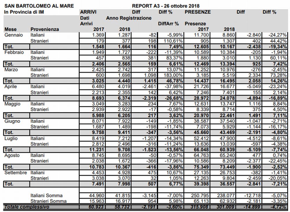 Dopo Diano Marina e Rapallo, la medaglia di bronzo per questa grave classifica spetta a San Bartolomeo al mare che secondo i dati aggiornati  dell’Osservatorio turistico regionale, ne mese di settembre ha perso il 7,21% portando le presenze turistiche su base annua ad un -4,72%.