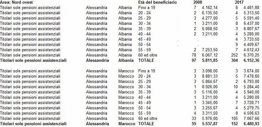 Se in provincia di Alessandria nel 2008 erano 3.041 gli assegni erogati di importo medio pari a 6.533 € annuali per un totale di 19.867.552 euro, attraverso un incremento costante nell’ultimo decennio si è arrivati al 2017 con 7.358 prestazioni di importo medio pari a 7.172 € annui, pagate a cittadini extracomunitari, per un totale di 52.773.268.