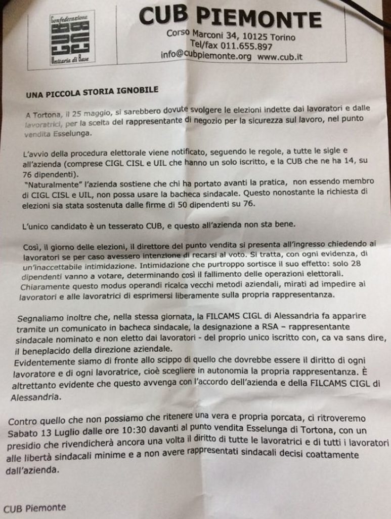 “Esselunga – aggiungono i lavoratori – nega l’ uso della bacheca sindacale per poter affiggere le comunicazioni elettorali in quanto noi del sindacato CUB (unico sindacato tra i destinatari dell’ avvio della procedura elettorale ad appoggiare l’ iniziativa elettorale presa dai lavoratori) non eravamo, secondo il direttore del punto vendita, “autorizzati” (parola usata proprio dal direttore) all’ uso della bacheca sindacale per queste comunicazioni.- il giorno delle elezioni, 25 maggio 2019, visto la non concessione dell’ utilizzo della bacheca sindacale per informare i lavoratori e neanche l’ uso della sala ristoro interna al punto vendita per poter effettuare materialmente le votazioni, i lavoratori hanno votato nel salone della Croce Rossa di Tortona situata proprio di fronte al punto vendita Esselunga di Tortona. Purtroppo per una velata intimidazione non si è riusciti a raggiungere il quorum per 11 voti.- lo stesso giorno delle elezioni 25 maggio 2019 la Filcams Cgil di Alessandria affigge in bacheca sindacale nel punto vendita di Tortona la nomina di RSA del suo unico iscritto. Nomina fatta, ovviamente, dopo che la Cgil è venuta a conoscenza dell’ avvio delle procedure elettorali, da parte dei lavoratori, per eleggere il RLS.”