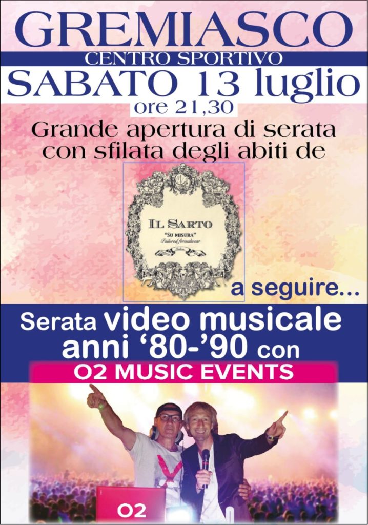 Arriva l’estate e Sabato 13 luglio presso il centro sportivo di Gremiasco, si terrà a partire dalle 21.30, una sfilata con gli abiti de “il Sarto” di Tortona e a seguire serata video musicale anni 80/90