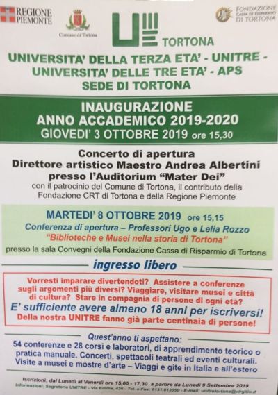 Si inizia Giovedi’ 3 Ottobre alle ore 15,30 Auditorium Mater Dei CONCERTO DI APERTURA,Direttore Artistico Andrea Albertini, poi il primo incontro del nuovo Anno Accademico, si terrà Martedi‘ 8 Ottobre presso la Sala Convegni della Fondazione Cassa di Risparmio di Tortona, in Via Emilia 168, alle ore 15,15 ed avrà tema “Biblioteche e Musei nella storia di Tortona” Relatori: Ugo Rozzo e Lelia Rozzo.