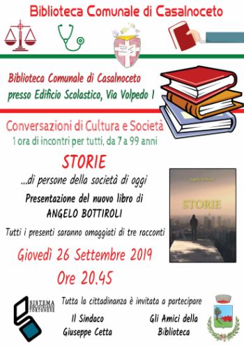 Il primo incontro sarà GIOVEDI’ 26 SETTEMBRE ORE 20.45  presso la BIBLIOTECA COMUNALE DI CASALNOCETO – Via Volpedo 1 (edificio scolastico) e vedrà appunto la presenza del noto giornalista locale che presenterà il suo ultimo libro “Storie”  omaggiando tutti i presenti con tre dei 27 racconti contenuti nel libro..