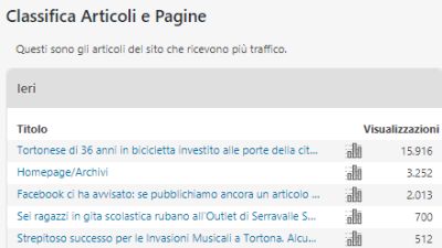 Nella giornata di ieri, come potete vedere dalla tabella sui dati che pubblichiamo a lato l’articolo sull’incidente stradale che purtroppo ha provocato la morte di un tortonese di 36 anni, è stato “aperto” e letto da quasi 16 mila persone (per visualizzazioni si intende questo).