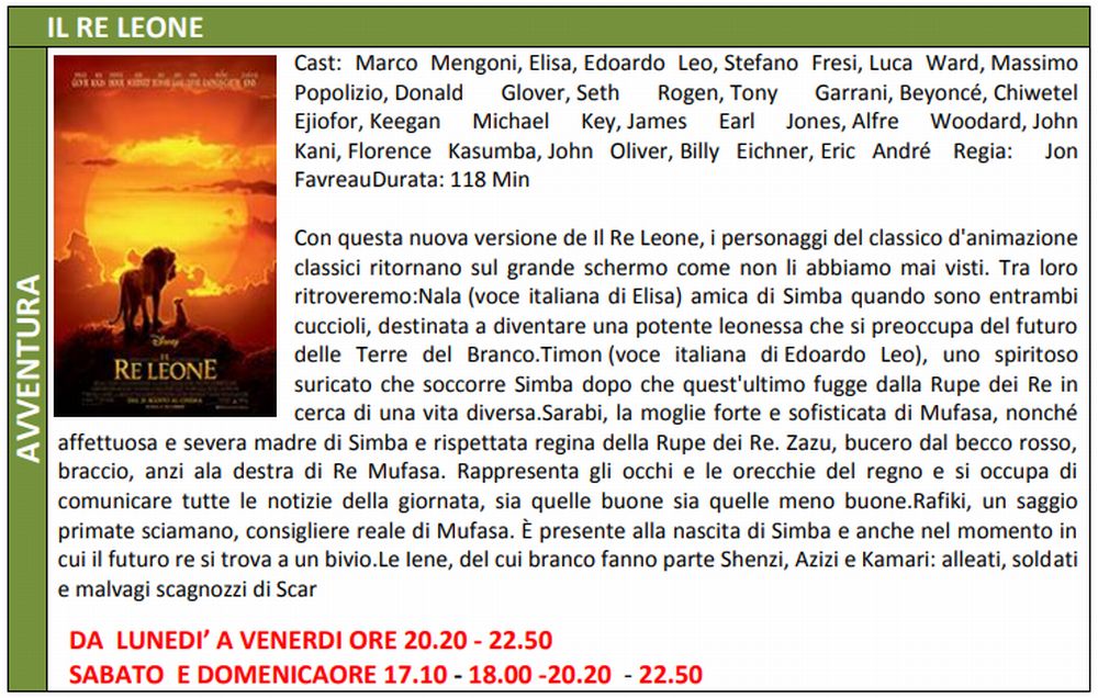 Ci sono film destinati a sbancare il botteghino e uno di questi è “Il Re Leone”. La versione graficamente perfetta della storia di Mufasa e di suo figlio Simba è così richiesto che per consentire a tutti una visione ottimale, la multisala Megaplex Stardust di Tortona ha predisposto ben due visioni pomeridiane: alle 17,10 e alle 18, così da evitare resse.