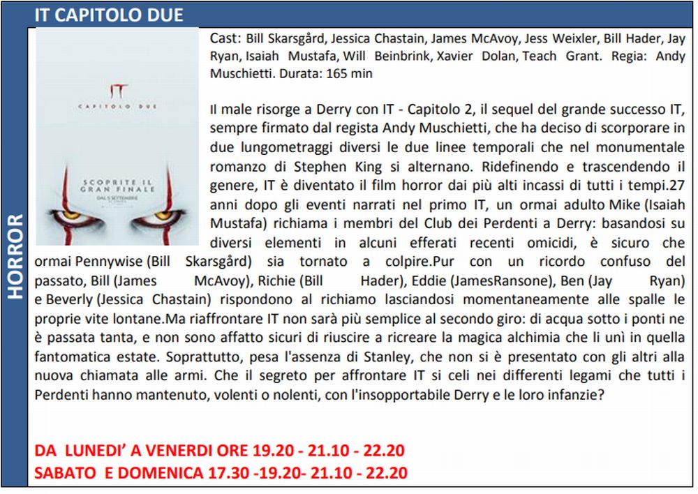 Fil da non perde anche IT capitolo due il sequel del famoso film horror e per chi non l ha ancora visto “Attacco al potere 3”