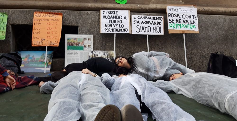 “Noi studenti e studentesse di Fridays For Future Alessandria – dicono – siamo “caduti” in pieno centro città, simulando l’impotenza e il destino che ci attendono se non avverrà il prima possibile un’inversione completa della rotta. Abbiamo espresso le nostre necessità tramite un “die in”, una forma di protesta che simula la morte per una causa ingiusta.