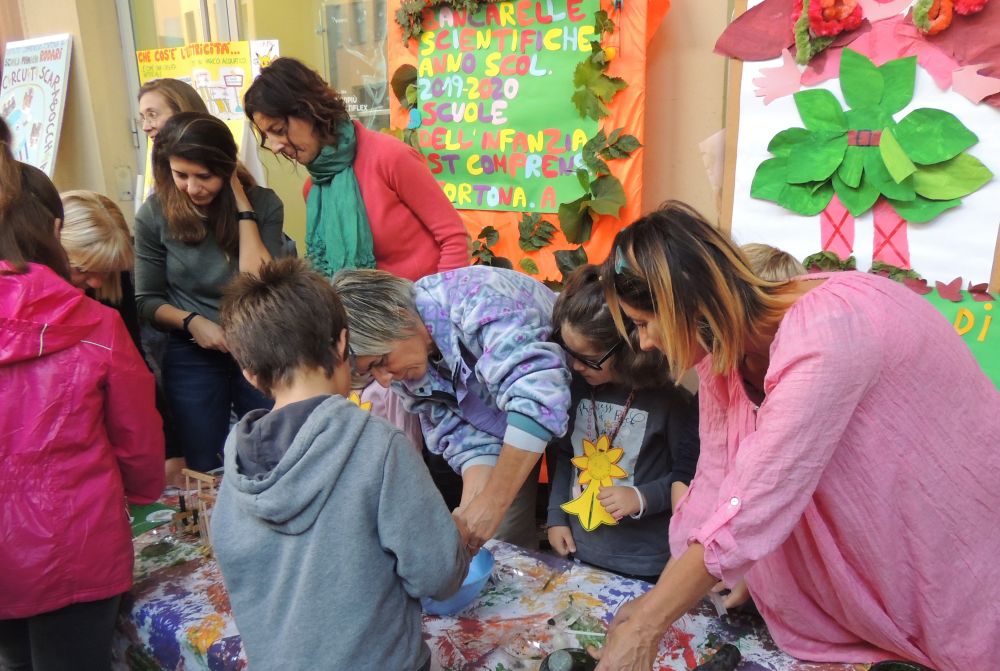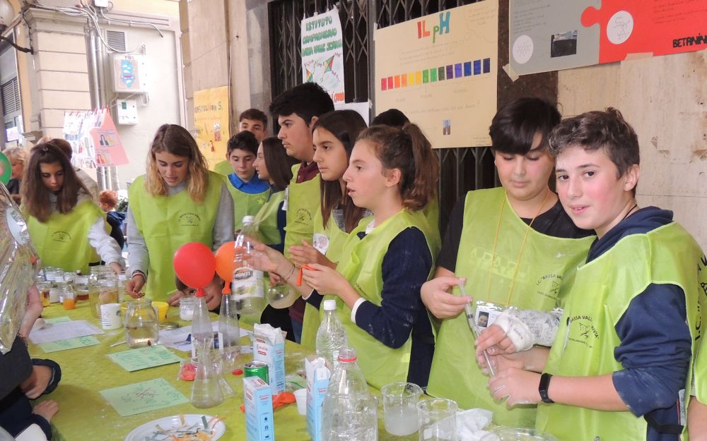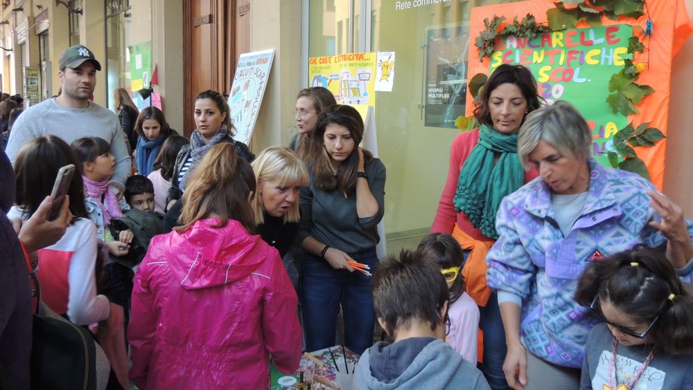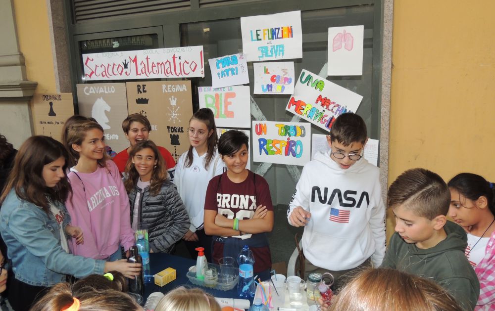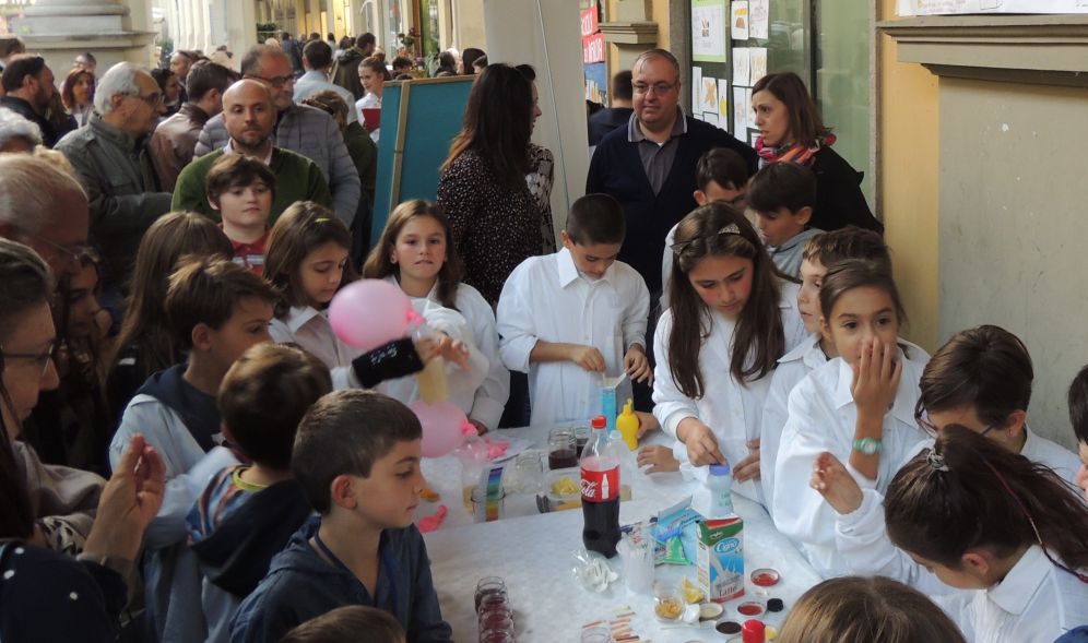 Decine di bambini accompagnati dai genitori presentano esperimenti e prove scientifiche ai presenti che affollano la zona.