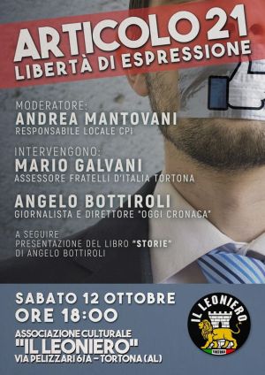 Ma la libertà di espressione non riguarda solo i social e a Tortona se ne parlerà sabato prossimo 12 ottobre alle 18 nella sede del Circolo “Il Leoniero” di CasaPound in via Pellizzari 6A, in un dibattito pubblico moderato da Andrea Mantovani con la partecipazione del segretario locale di Fratelli d’Italia Mauro Galvani e il sottoscritto, Angelo Bottiroli, direttore di Oggi Cronaca.