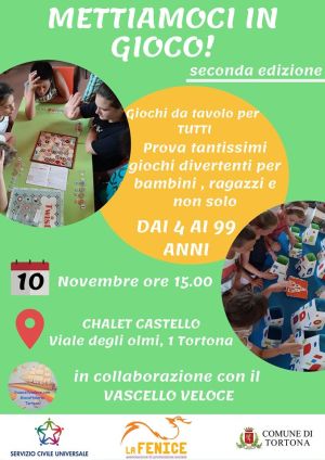 A Tortona in viale degli Olmi, 1 domenica 10 novembre alle ore 15 allo Chalet Castello si svolgerà la 2ª edizione di “Mettiamoci in gioco” con giochi da tavolo per tutti dai 4 ai 99 anni.