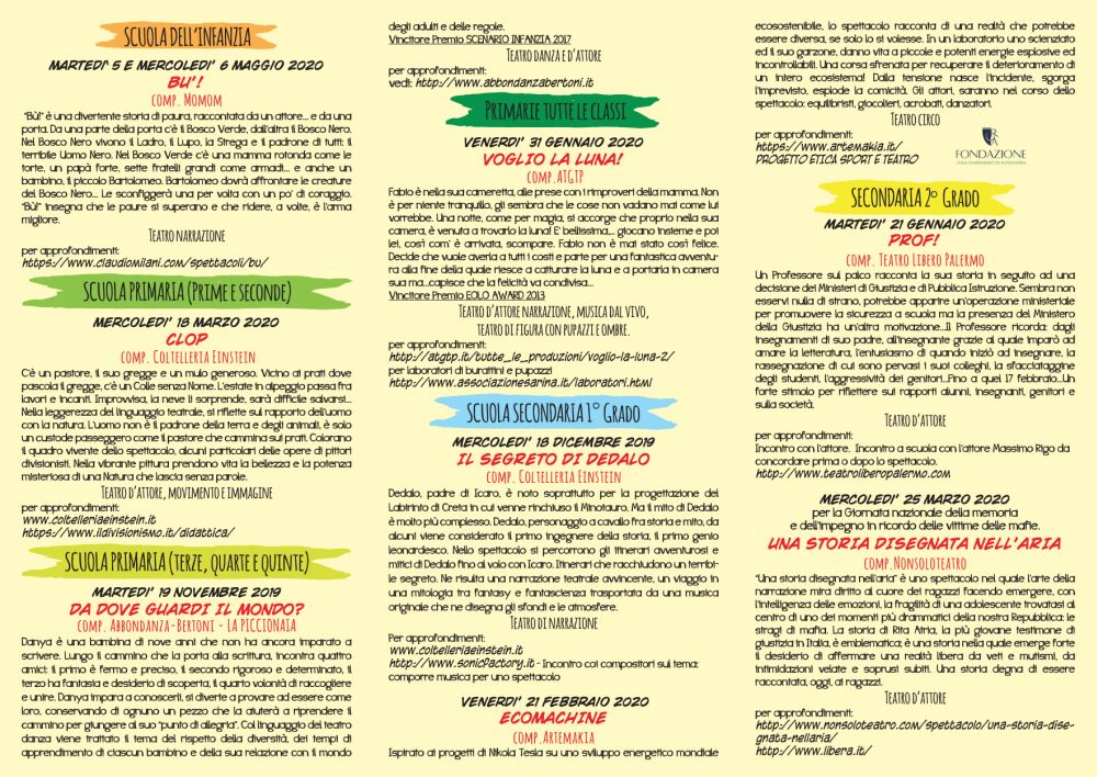 Otto saranno i titoli in cartellone. “BU” della compagnia Momom per la scuola dell’infanzia. Per le scuole primarie: “Da dove guardi il mondo?” compagnia Abbondanza-Bertoni – La Piccionaia, “Clop” compagnia Coltelleria Einstein, “Voglio la luna!” della compagnia ATGPT. Per la scuola secondaria di primo grado: “Ecomachine” della compagnia Artemakia e “Il segreto di Dedalo”. Per la scuola secondaria di secondo grado: “Prof!” del Teatro Libero di Palermo e “Una storia disegnata nell’aria” della compagnia Nonsoloteatro”. La scelta degli spettacoli offre un ventaglio di tematiche e di tecniche teatrali differenti.