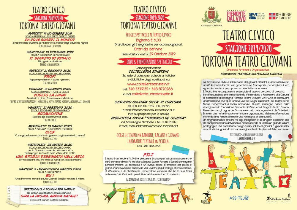 La stagione teatrale 2019-2020 per i bambini e i ragazzi delle scuole di Tortona e del territorio è promossa dal Comune di Tortona insieme alla Fondazione Piemonte dal Vivo, al Progetto Teatro e Giovani Piemonte e alla compagnia teatrale Coltelleria Einstein che ne cura la direzione artistica e organizzativa.