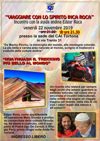 Venerdì 22 novembre prsso la sede del Club Alpino Italiano in via Trento a Tortona si terrà una serata dal titolo “VIAGGIARE CON LO SPIRITO INCA ROCA” Incontro con la guida andina Edgar Roca che tratterà il tema “Da Machu Picchu, la meraviglia del mondo, alle montagne colorate. La più bella e variata area naturale al mondo scrigno di tradizioni e costumi delle culture andine: HUAYHUASH IL TREKKING PIÙ BELLO AL MONDO”