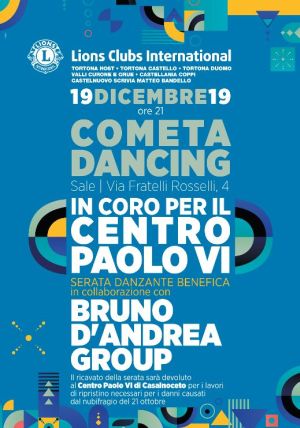 Appuntamento con la solidarietà, giovedì 19 dicembre, alla Cometa Music Hall di Sale, dove sei club Lions del tortonese hanno organizzato una serata danzante per raccogliere fondi da destinare al Centro Paolo VI di Casalnoceto, la struttura della Diocesi di Tortona che ha subito gravi danni in seguito al violento nubifragio che si è abbattuto sulla zona nello scorso mese di ottobre.