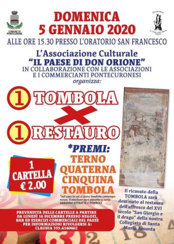 Si tratta di una tombola con tanti e ricchi premi, organizzata sempre dall’Associazione culturale “Il paese di don Orione-ONLUS” insieme a gran parte delle associazioni del paese, dei commercianti e di alcuni privati cittadini, con il patrocinio del Comune, tutti accomunati dal piacere di un impegno per conservare e tramandare il patrimonio artistico di Pontecurone.
