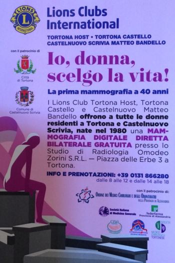 Parliamo del progetto “Io, Donna, scelgo la Vita! La prima mammografia a 40 anni” allestito dai service dei Lions Club Tortona Host, Tortona Castello e Castelnuovo Scrivia “Matteo Bandello” con il patrocinio dei Comuni di Tortona e Castelnuovo Scrivia.