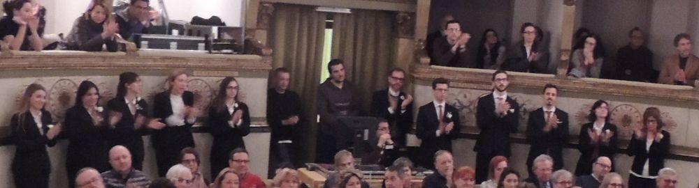 Tutte le “maschere” del Teatro Civico, insieme all’addetta alla biglietteria Paola, al responsabile Filippo Arata e al direttore artistico Paolo Zanchin si sono schierati in piedi dietro l’ultima fila della platea e, insieme a tutto il pubblico salutato la loro amica e collega di lavoro: Donatella, in un forte ideale abbraccio.