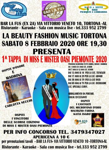 Nuovo appuntamento con la bellezza e l’ allegria: sabato prossimo, 8 febbraio 2020 alle ore 21 presso il locale Lafus-Gastronomia musicali in Via Vittorio Veneto 10 a Tortona, si svolgerà la prima tappa del concorso di bellezza “Miss e Mister Oasi Piemonte” della Beauty Fashion Music Tortona di Lucia Guarini.