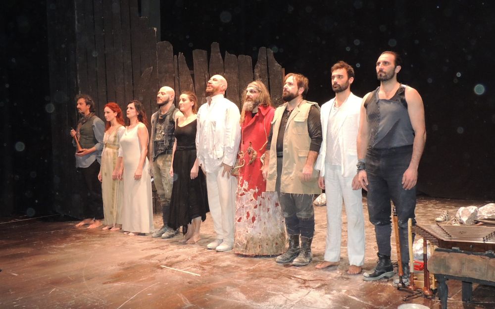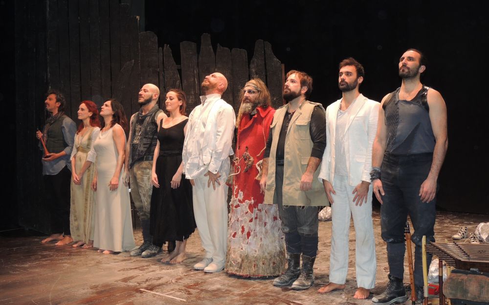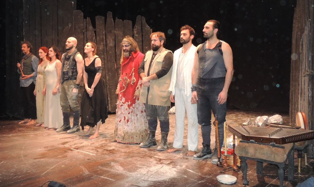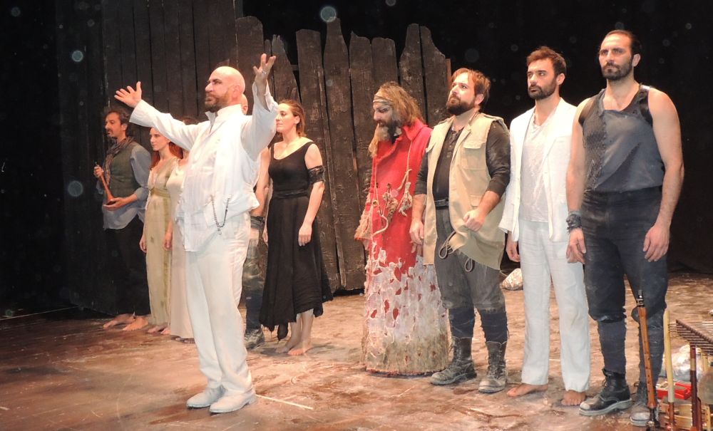 “La musica greco/turca – dice Romano – si è sviluppata in modo sinergico per molto tempo, quindi mi sembrava giusto utilizzare strumenti di quest’area, cioè Grecia, Turchia, Egitto, Siria. Le pelli sono il bendir, grande e profondo tamburo a cornice comune con piccole varianti a tutta questa zona e il riqq, un tipico tamburo con anelli tradizionale a tutta l’area araba (in Italia con le dovute differenze nel legno e nelle pelli utilizzatesi trasforma nel tamburello napoletano e anche nella tamorra, I fiati che ho usato sono diversi: la zurna turca, strumento appartenente alla famiglia degli oboi, il mizmar, egiziana trombetta solo in canna un doppio flauto in canna che nell’antica Grecia si chiamava Aulos (fatto costruire appositamente per l’inizio dello spettacolo dal bravissimo artigiano Giovanni Saviello) e un piccolissimo fluier in legno. Lo strumento più moderno che utilizzo è il profondo e affascinante chalumeau, figlio diretto del bellissimo duduk armeno, unica licenza moderna/antica nei vari suoni utilizzati durante lo spettacolo “Antigone”; tutto il resto è creato dal vivo tramite l’utilizzo del fischio, della mia voce, del mio soffio…”