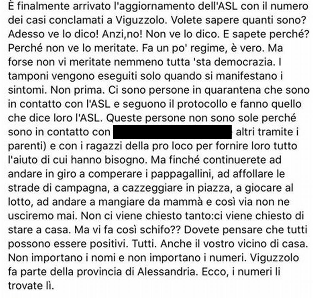 Da noi a Viguzzolo, a quanto pare, dimenticano perfino l’educazione. Siccome sono stati criticati perché non hanno fatto la sanificazione, alcuni si rivolgono ai compaesani con arroganza.