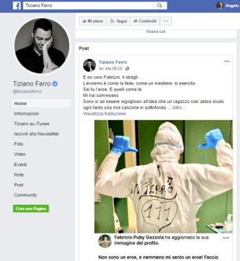 “E no caro Fabrizio, ti sbagli. – Replica Tiziano Ferro – L’eroismo è come la fede, come un mestiere: si esercita. Sei tu l’eroe. E quelli come te. Mi hai commosso. Sono io ad essere orgoglioso all’idea che un ragazzo così abbia avuto ogni tanto una mia canzone in sottofondo. Un’altra cosa: ti conosco bene. Ci conosciamo bene. E voi sapete di chi sto parlando. Grazie.”