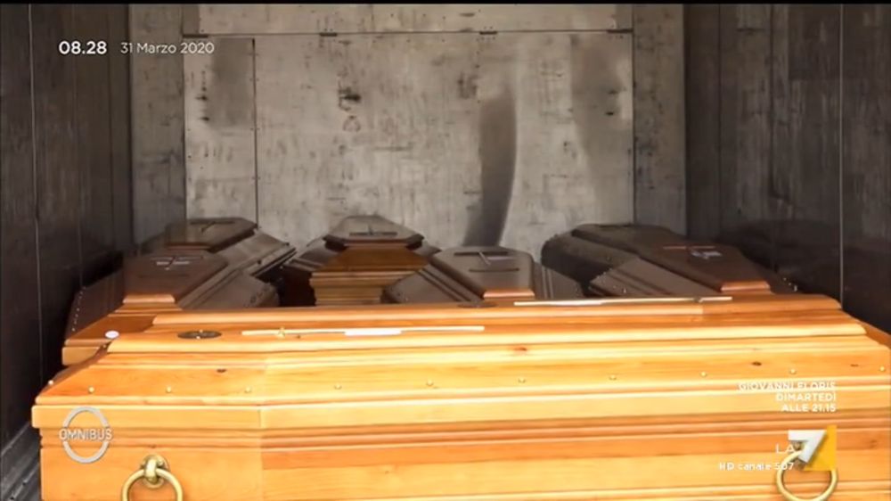Il servizio televisivo si apre con l’immagine del container e delle bare e anche questa dopo le bare all’interno della chiesa di Santa Maria delle Grazie, al cimitero, rimmarrà presumibilmente come icona di questa immane tragedia.