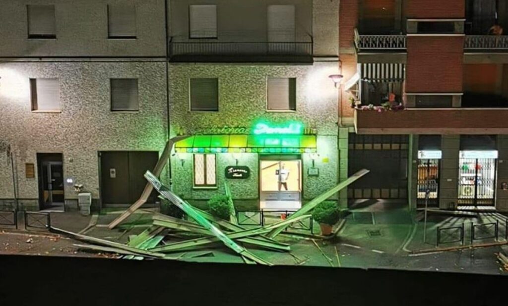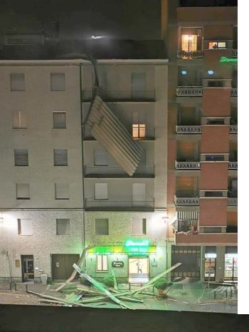 Dal condominio in questione, sopra una gelateria, si è letteralmente staccato il tetto cadendo in parte a terra e in parte rimanendo penzolante davanti a due balconi come si vede nell’immagine (poi staccato per evitare ulteriori e gravi danni).