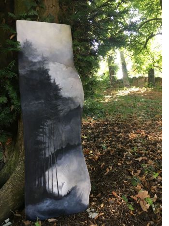 Chiara Cebrelli, pittrice, attraverso le sue opere racconta le atmosfere rarefatte dei boschi, dell’aria, degli animali e dei cieli notturni illuminati da stelle lontane. Lei stessa si racconta: “ Nel momento di chiusura entrai nel bosco silenzioso, con una coperta fatta di nuvole. Come ne uscii… lo raccontano i miei dipinti su legno”. Un viaggio poetico alla scoperta del proprio spirito attraverso le meraviglie della natura, boschi ancora incontaminati, toccati solo dalle nubi, da costellazioni celesti o dai passi leggeri degli animali. Terre di confine dove l’anima si apre a nuove ed antiche esperienze, racconti lontani che rinascono in una nuova veste. Il fitto della vegetazione lascia spazio a squarci di cielo notturno, dove la costellazione delle Pleiadi, le sette sorelle, illumina il cammino dei pochi che cercano la strada di casa. Tinte leggere come acquerelli, che svelano le linee sinuose del legno, si dilatano sul tessuto vegetale dissolvendosi in un’armoniosa danza fatta di bianco e nero.