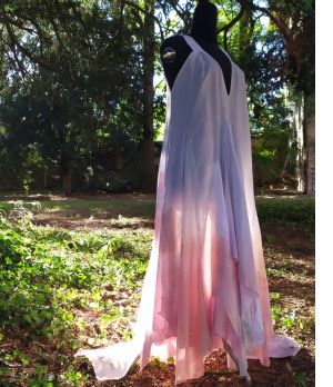 I Ricicl-abiti sono forme composte da frammenti di tessuto vegetale avanzati dalla confezione di abiti realizzati su misura. I lembi non vengono uniti nel modo consueto ma lasciati liberi di sfilacciarsi. La materia vegetale trasformata in fibra può ancora essere libera di librarsi, di muoversi all’aria come se fosse ancora stelo legato alla terra. Il risultato è totalmente inconsueto e il colore presente sulle fibre naturali è ricavato da spezie di cucina, vino e fondi di caffè. Il suo messaggio è semplice: ogni cosa che noi facciamo o creiamo ha un impatto sull’ambiente. Il cercare di riutilizzare il più possibile, impegnandoci a creare meno rifiuti, è doveroso e in questo caso anche meravigliosamente bello.