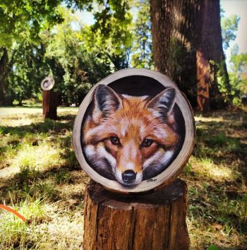 Carlotta Paesotto, pittrice sensibile ed accurata, dipinge gli animali del bosco. Il bosco per lei é un luogo magico, ha i suoi mille occhi, le sue mille voci e gli animali conoscono il mistero della vita e della morte e possono insegnarcelo. Le parole dell’artista raccontano di una simbiosi creativa con la materia: “ Il legno é il mio elemento e la base per i miei dipinti: ci sono le trame oniriche delle sue venature, la rugosità della corteccia e un intenso profumo di resina che permane nonostante il passare degli anni. Il bosco che dipingo si anima di presenze magiche e guardinghe, come la sfuggente lepre o l’astuta volpe…o come il mio doppio autoritratto, che ricorda quanto sia importante rimanere connessi con le proprie radici. Proprio come in un bosco.” Emozioni intense pervaderanno lo spazio tra voi e l’animale guida, guardando oltre lo saprete cogliere, lo riconoscerete.