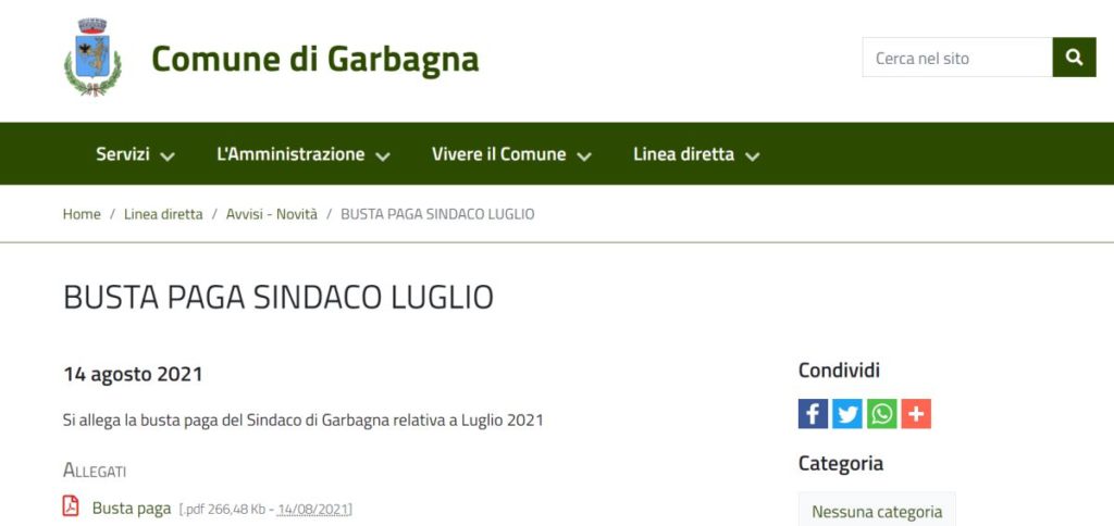 Risposta semplice: controlla i siti dei vari Comuni della zona e durante questa ricerca abbiamo notato che il Sindaco di Garbagna, Fabio Semino, di 52 anni, in carica dal 27 maggio 2014, ha pubblicato la busta paga dell’indennità che percepisce come primo cittadino: 550 euro lorde al mese che nette fanno 423,50 euro.