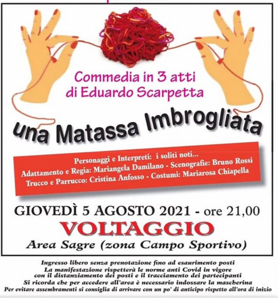 Giovedì 5 agosto 2021, alle ore 21, presso l’Area Sagre a Voltaggio, con ingresso ad offerta, andrà in scena il nuovo spettacolo della Compagnia del Bollito: Una matassa imbrogliata.