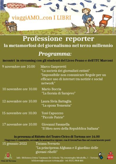 Nell’ottica della promozione della lettura, gli incontri prenderanno spunto dalla presentazione degli ultimi libri editi dai giornalisti per avviare poi un discorso più ampio che riguarda il loro lavoro di saggisti, documentaristi e reporter, a seconda degli incarichi e delle professionalità degli stessi. Sono previsti collegamenti da remoto così da poter permettere la partecipazione in sicurezza alle scuole di Tortona. Gli interventi saranno poi registrati e accessibili anche al pubblico dal sito del Comune e dalla pagina Facebook della Biblioteca Civica.
