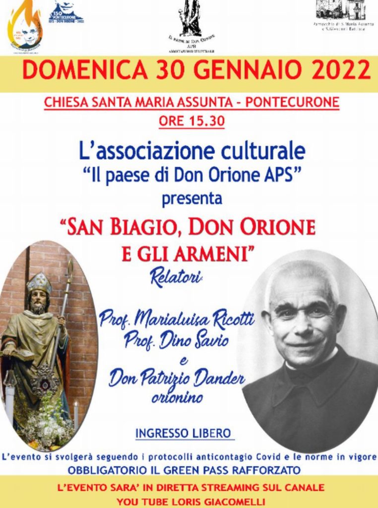 L’ associazione culturale “Il paese di don Orione APS” organizza il convegno “San Biagio, don Orione e gli Armeni”, visto che che si svolgerà domenica 30 gennaio a Pontecurone, paese natale del Santo, nella collegiata di Santa Maria Assunta alle ore 15.
