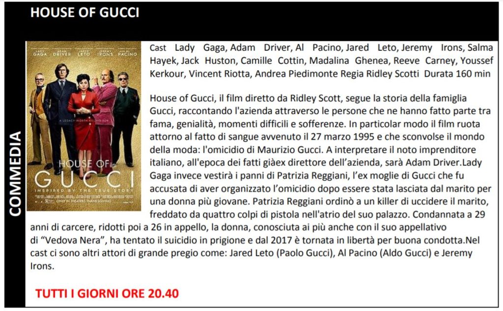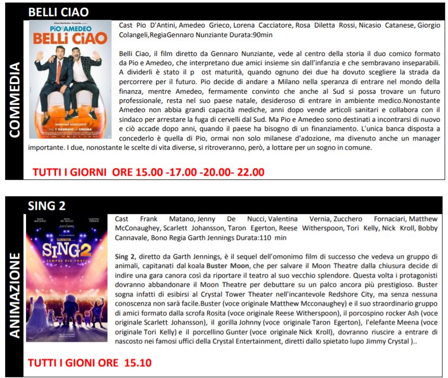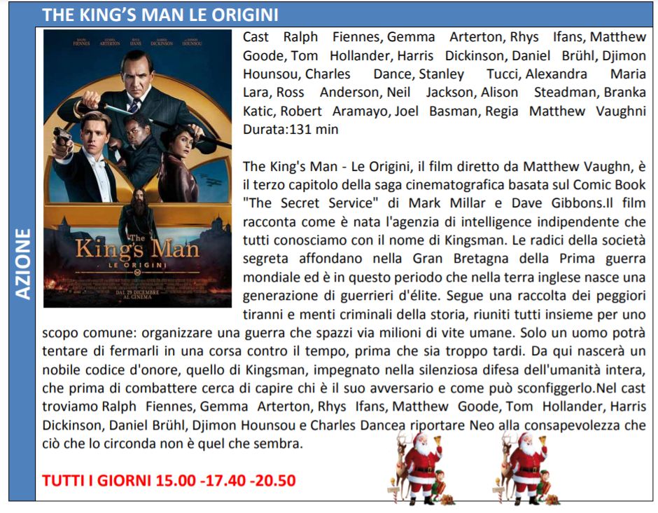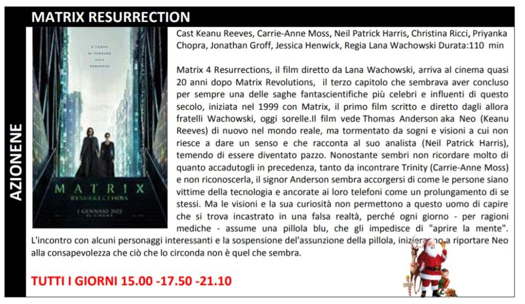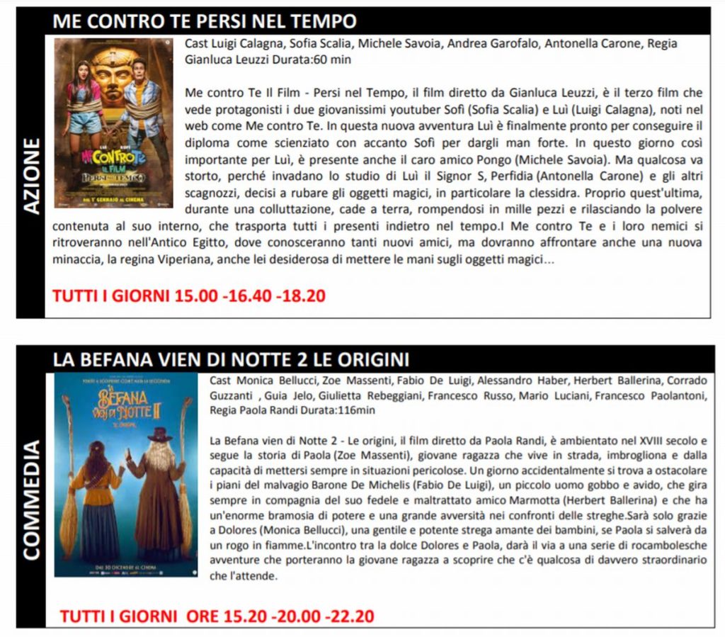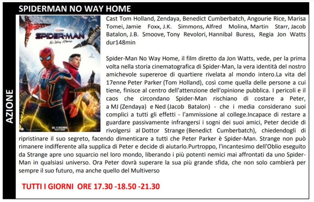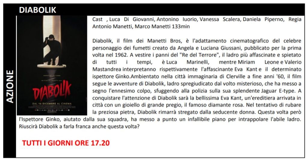 Le prenotazioni non ritirate entro tale limite verranno automaticamente cancellate dal sistema. Gli orari indicati nel presente flyers indicano l’inizio del film. La programmazione potrebbe subire variazioni. Ricordiamo che i posti in sala sono assegnati.