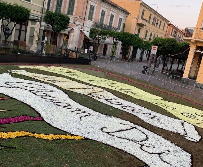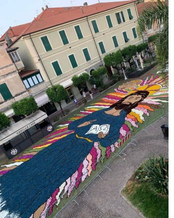 Dopo due anni di assenza dovuti alla pandemia, è tornata a Diano Marina in tutto il suo splendore la meravigliosa “Infiorata” in occasione della festività del Corpus Domini. I lavori, iniziati nel tardo pomeriggio di sabato 18 giugno, si sono conclusi alle prime luci dell’alba di domenica 19 giugno; la realizzazione è stata a cura del Gruppo “Amici dell’Infiorata” e da tanti volontari sotto la guida dell’artista Nives Bonavera, ideatrice di quella che è a tutti gli effetti una vera e propria opera d’arte, che ha voluto spiegare il significato dei disegni rappresentati sul manto stradale del centro cittadino dianese: