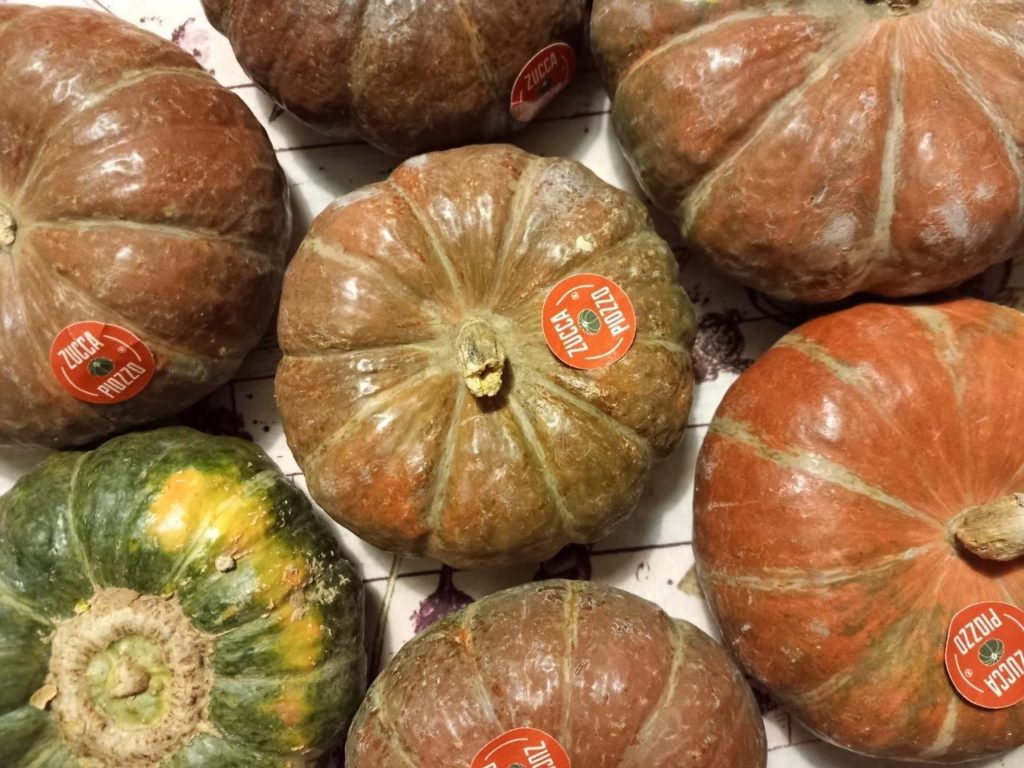 Zucca Piozzo: pesa al massimo 1 kg, scorza verde scuro, che maturando diventa arancione. Polpa giallo-arancio, soda e tenera, di straordinaria qualità. Utilizzata soprattutto per il risotto, consigliata per purée, ripieni e minestre. La più tipica: anni di ricerche hanno portato a registrazione del marchio e del disciplinare presso il Mipaaf.