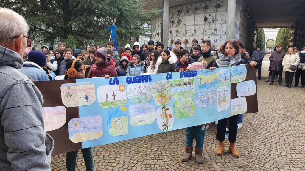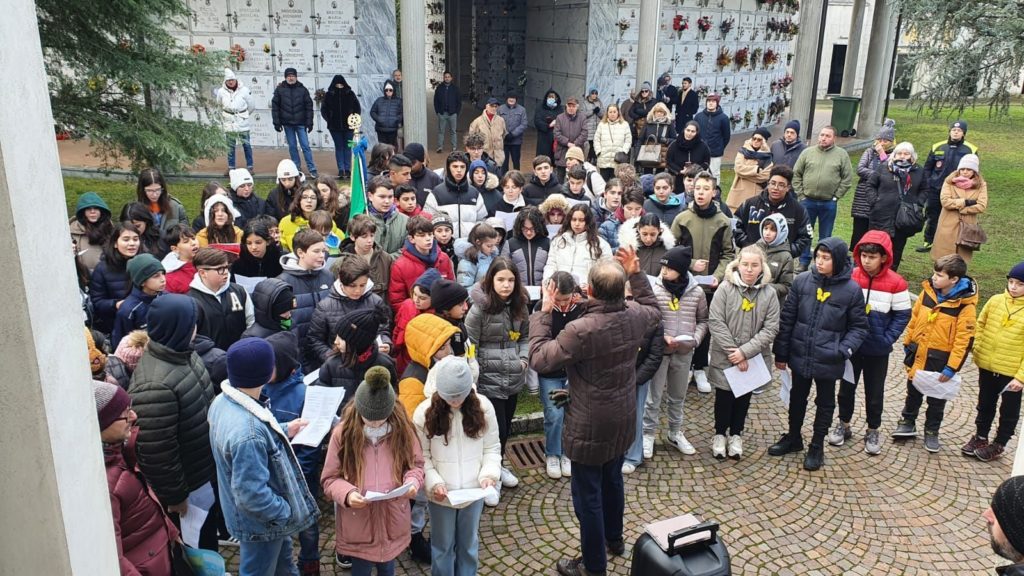 Il terzo momento della commemorazione, certamente il più tradizionale e coinvolgente, è stato il corteo degli alunni della Quinta Primaria e di tutte le classi della Secondaria, i quali, insieme a Professori, Sindaco, Amministratori, genitori, nonni, cittadini e rappresentanti di varie associazioni con i loro labari, hanno raggiunto il cimitero. Qui, guidati dal prof. di musica Campese e da altri insegnanti, i ragazzi hanno recitato, letto, cantato e mostrato quanto avevano preparato per il Giorno della Memoria 2023. Le scelte dei testi e dei materiali, fatte insieme ai loro insegnanti, sono state accurate e molto significative. I presenti hanno applaudito i ragazzi con sincera ammirazione per la loro preparazione.