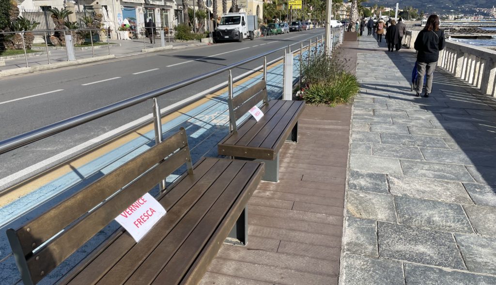 Dopo aver sistemato la Rosa dei venti e qualche piccolo intervento sulla pavimentazione della passeggiata (che proseguirà nei prossimi gironi) il Comune di Diano Marina guidato dal Sindaco Cristiano Zà Garibaldi ha iniziati a tinteggiare le panchine della passeggiata. Ne mancano solo quattro per concludere i lavori.
