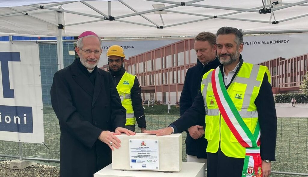 Si è svolta oggi pomeriggio, martedì 5 dicembre, la cerimonia di posa della prima pietra presso il cantiere per la costruzione del nuovo edificio scolastico in viale Kennedy a Tortona. Dopo l’abbattimento dello storico immobile, inagibile per motivi di sicurezza dal 2018, inizia ora la costruzione del nuovo che ospiterà la scuola primaria “Salvo d’Acquisto” (istituto Comprensivo Tortona B).