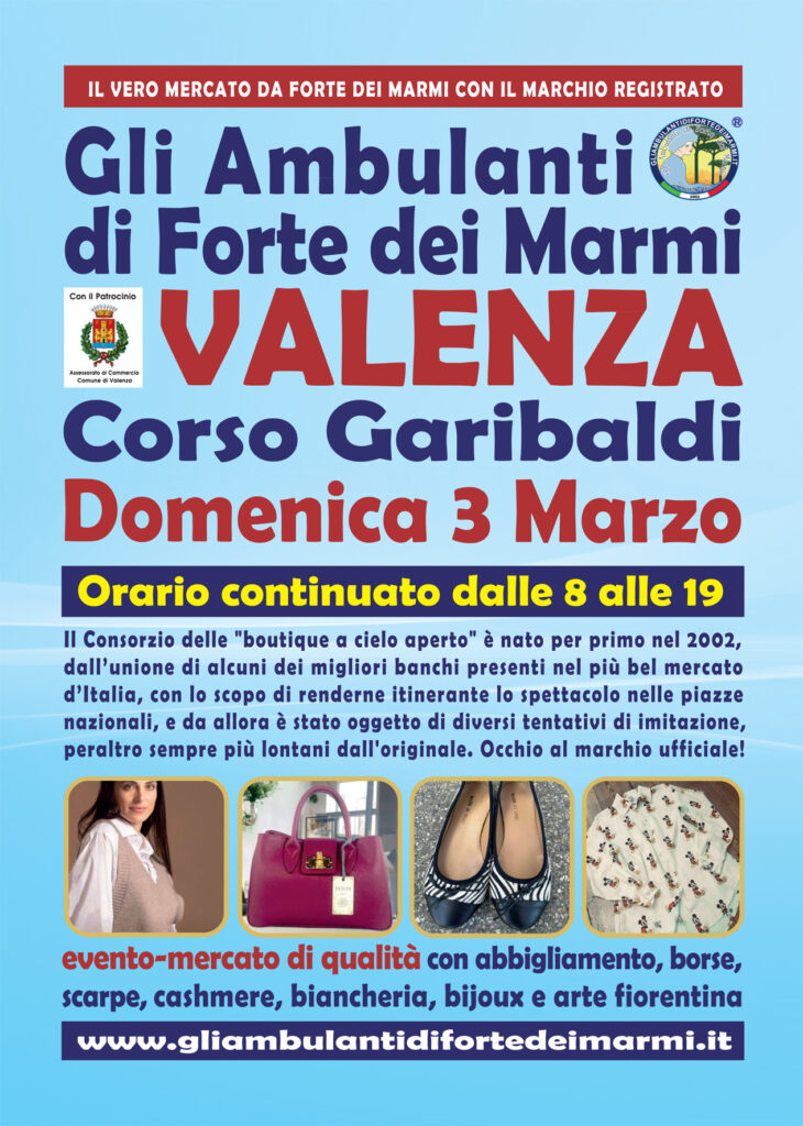 Gli Ambulanti di Forte dei Marmi, le bancarelle del mercato di qualità più famoso d’Italia, tornano finalmente nell’Alessandrino, a grandissima richiesta, con tutto il meglio del Made in Italy artigianale e le ultime tendenze della moda. Si potranno infatti ammirare le ormai mitiche “boutique a cielo aperto” dell’originale Consorzio domenica 3 marzo a VALENZA, nella centrale location di Corso Garibaldi, con partenza da Piazza Antonio Gramsci. Dunque, un appuntamento da non perdere assolutamente per i tanti appassionati del genere, come sempre all’insegna dello shopping più glamour e conveniente, con orario continuato dalle 8 alle 19.