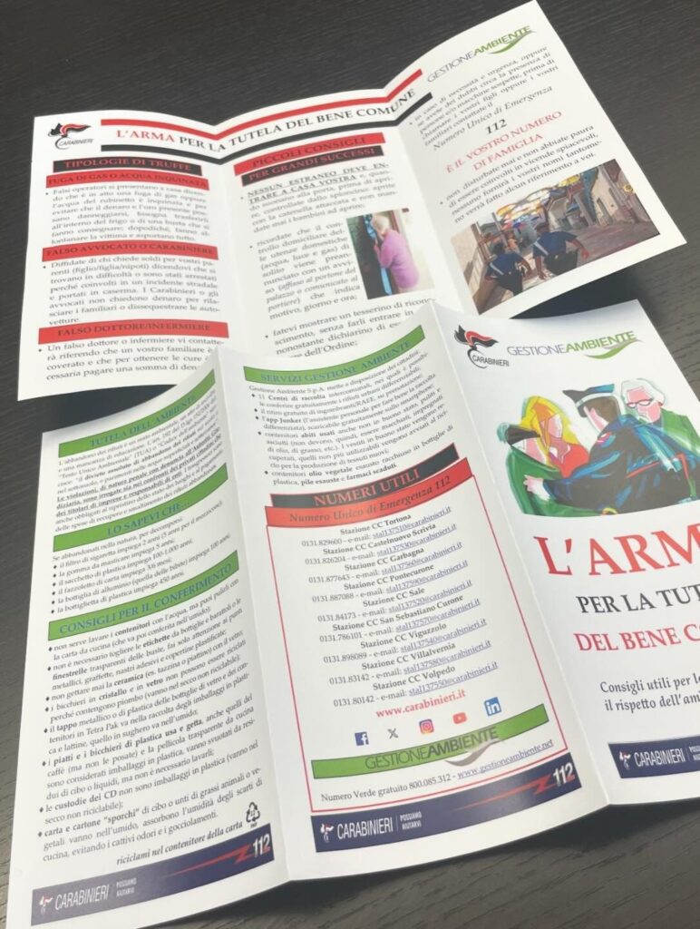 E’ stata presentata ieri l’iniziativa promossa dall’Arma dei Carabinieri in collaborazione con la società Gestione Ambiente per la diffusione dei depliant “L’Arma per la tutela del bene comune – Consigli utili per la nostra sicurezza e per la tutela dell’ambiente che ci circonda” contente consigli utili per evitare truffe e per una corretta gestione dei rifiuti domestici. I volantini sono in distribuzione all’interno delle bollette dei rifiuti spedite in queste settimane. Alla conferenza stampa di presentazione hanno partecipato il Colonnello Massimiliano Rocco comandante provinciale dei Carabinieri, il Presidente della Provincia di Alessandria Enrico Bussalino, il Capitano Domenico Lavigna comandante Compagnia Carabinieri di Tortona, il Sindaco Federico Chiodi e il Vice Fabio Morreale, il presidente di Gestione Ambiente Pierpaolo Civeriati e l’amministratore delegato Marco Peretti.