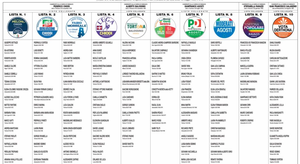 Di seguito il manifesto con tutti i nomi e i dati dei candidati in lizza che trovate anche nel documento ufficiale https://www.oggicronaca.it/wp-content/uploads/2024/05/100×70-Tortona.pdf